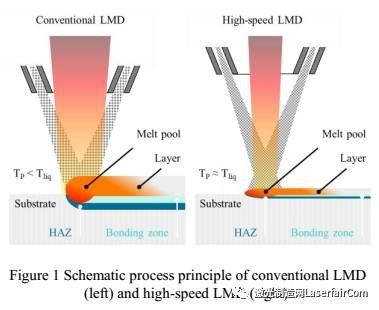 常规的激光熔覆是熔化基体材料和粉末,然后在此基础上产生熔池-它们仅在该平面中熔合。而超高速激光熔覆是将粉末颗粒加热到接近熔化温度,这既增强速度又有助于降低涂层厚度。两个过程原理如图1所示。粉末颗粒在高温下产生或多或少的熔融颗粒,而其仅需要与基材的熔池短暂接触就可以产生所需的冶金结合。相比传统工艺在熔池里熔化颗粒,这种方法带来了速度提升。相比之下基材中的熔池所需能量少了很多。在一些情况中,使用等量粉末的条件下,所需的激光功率可达到20KW,而高速激光熔覆工艺只需要2~4kW的激光功率。因此基于这种效率,同时减少购买资金投入以及运营成本,这种工艺更加经济实惠。最后,这种激光熔覆产生的是无孔涂层,表面具有非常低的粗糙度的,在涂覆后也仅需一些小小的处理。